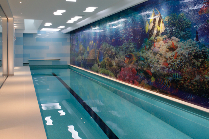 The basement has a large lap pool with a mosaic aquarium wall, jacuzzi, gym and treatment room