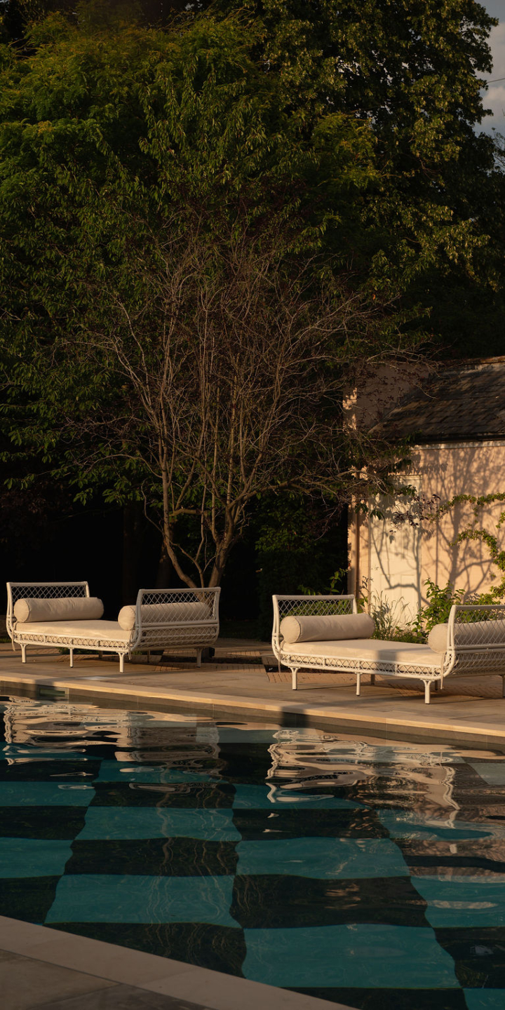 Checkerboard tiled pool with stucco arches, heated year round